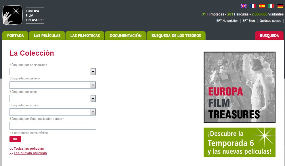 En lo referente al buscador, el servicio web nos permite realizar una búsqueda sencilla por filmoteca, por tema o periodo; o una búsqueda detallada dónde especificar la nacionalidad, el género, la copia, el sonido, el equipo de rodaje…