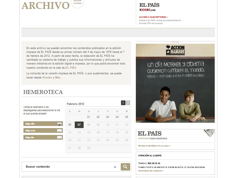En el archivo online de EL PAÍS podemos encontrar los números de su edición impresa desde su primera tirada del 4 de mayo de 1976 hasta el 7 de febrero de 2012. Si nos interesan contenidos posteriores se pueden con consultar en la web del periódico. Para realizar las búsquedas podemos seleccionar el año, el mes y el día o y consultar las noticias publicadas aquel día pero no podemos ver la edición en papel digitalizada. Si buscamos varias noticias sobre algún personaje o temática determinada podemos utilizar el buscador que se encuentra en la parte inferior.