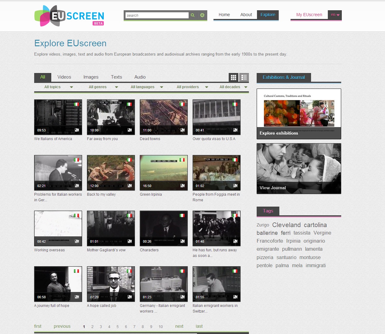 - Exposiciones virtuales de contenido de cada proveedor: Como parte del proyecto EUscreen, los archivos y las televisiones participantes desarrollan sus propias exposiciones virtuales sobre temas que ellos mismos han seleccionado. Cada exposición va acompañada de una serie de recursos como fotografías, documentos, audio y textos que permiten explorar e investigar temas específicos en profundidad.
