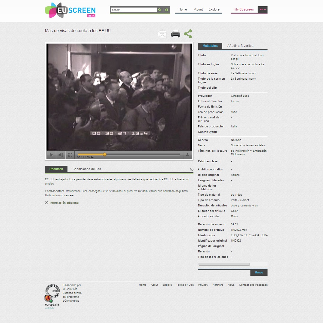El proyecto EUscreen tiene como objetivo promover el uso de contenidos de televisión para explorar la rica y diversa historia cultural de Europa. Este archivo audiovisual da acceso a más de 30.000 documentos con contenido e información de programas. Mediante el desarrollo de una serie de funcionalidades interactivas y enlaces dinámicos con Europeana, se facilita el acceso a los usuarios en los ámbitos cultural, educativo y recreativo.