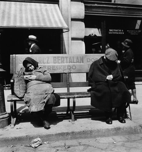 Hongarije, Boedapest 1930, slapende mensen op een bankje in de stad © Eva Besnyö / Maria Austria Instituut Amsterdam