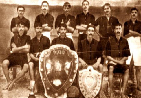 La selección de la India en la década de 1940, posando con la equipación y completamente descalzos
