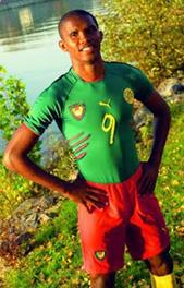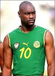 Samuel Etoo con el uniforme camerunés, de camiseta y pantalones en un pieza única, 2004 |
