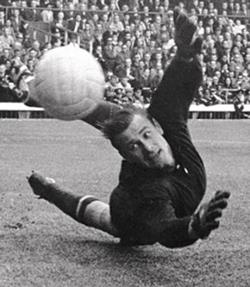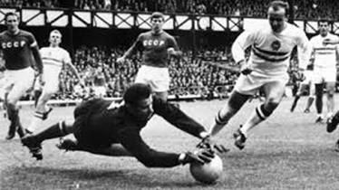 Lev Yashin, con guantes de portero, intentando realizar una parada