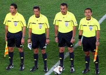 El árbitro posee un silbato, las tarjetas y un cronómetro. Los árbitros asistentes portan los banderines, y el cuarto árbitro inspecciona el equipamiento de los jugadores antes de saltar al campo. |