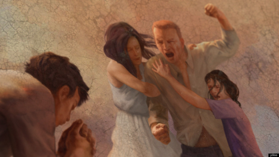 Un hombre enfadado es sujetado por su mujer y su hija mientras su hijo reza