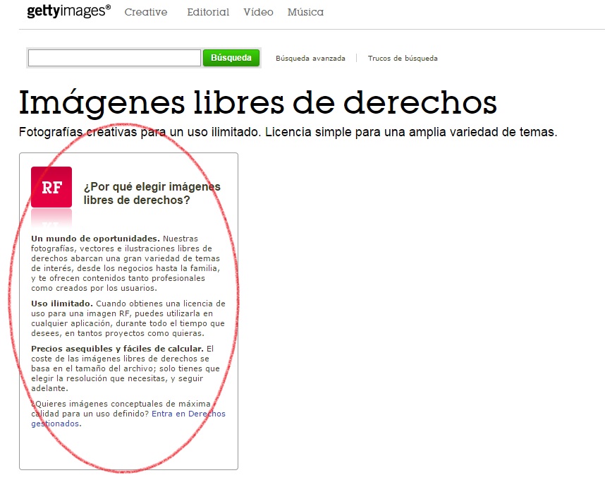 En el caso de Getty, como todos sabemos, encontramos imágenes de todo tipo, desde imágenes históricas hasta imágenes comerciales o artísticas. Si pinchamos en la pestaña de Creative nos da la posibilidad de entrar en el apartado «Libre de derechos»