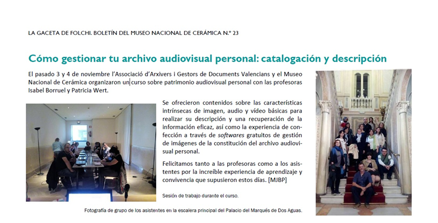 En el mes de Noviembre de 2014 impartimos para la Asociación de Archiveros de Valencia este curso. Nos encontramos en un momento en que la tecnología permite almacenar en nuestros ordenadores y otros dispositivos electrónicos una gran cantidad de contenido cuyo volumen llega a dificultar su gestión. En este curso propusimos la creación y gestión de un archivo personal con nuestras colecciones vídeos y audios pero centrándonos sobre todo en la gestión de nuestro archivo fotográfico.