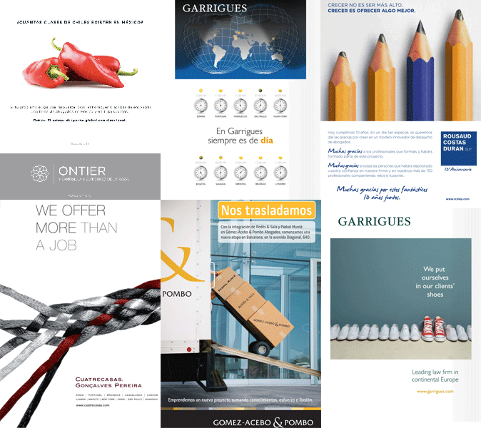 GARCÍA LEÓN, CARLOS. Los bufetes españoles dan sus primeros pasos en publicidad. 4 de agosto 2015 en Expansión.com <http://www.expansion.com/juridico/actualidad-tendencias/2015/08/03/55bfb7ec46163f26788b458d.html>